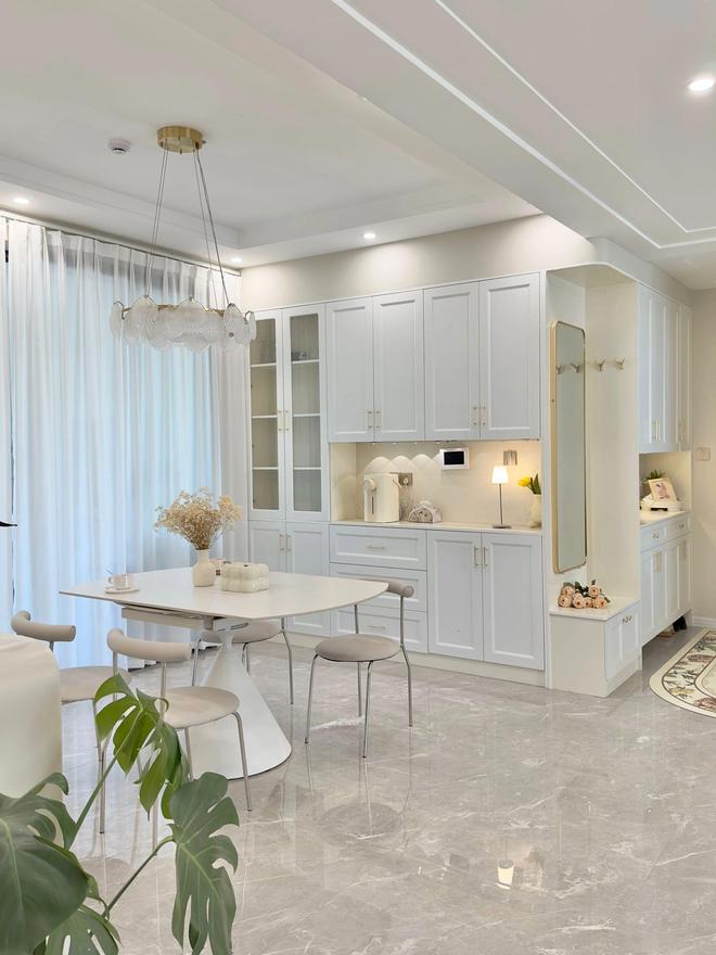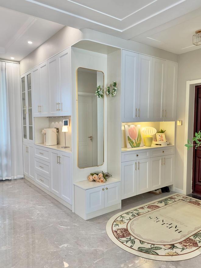 餐厅与玄关相邻,屋主便设计了L型“玄关柜+餐边柜”,柜体、柜门都是白色的,柜门做了简约的法式造型,搭配金色拉手,视觉感很精致。