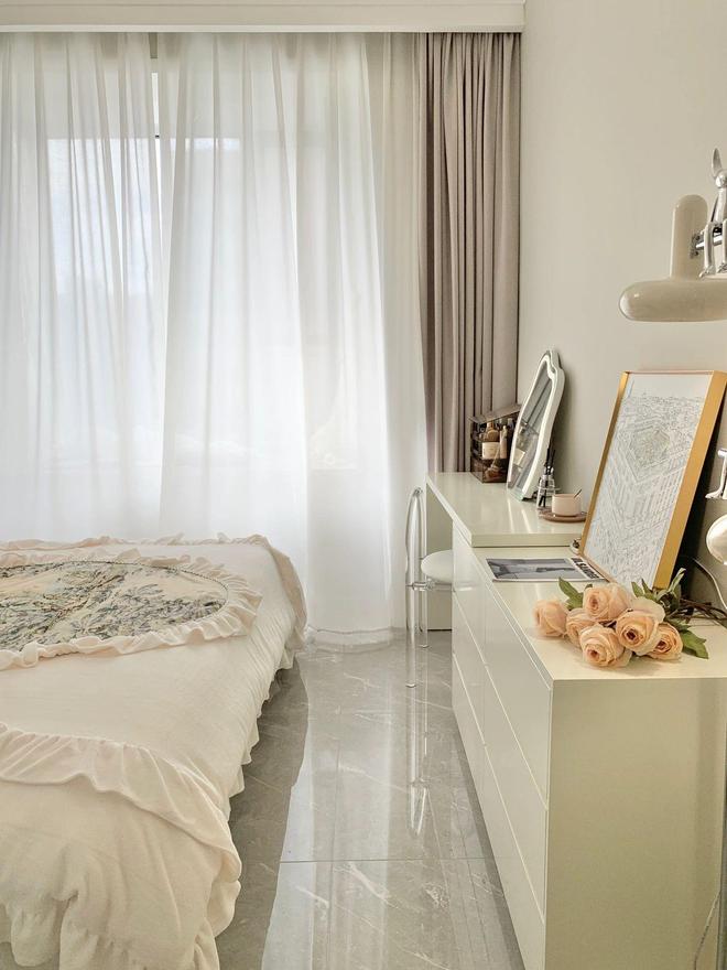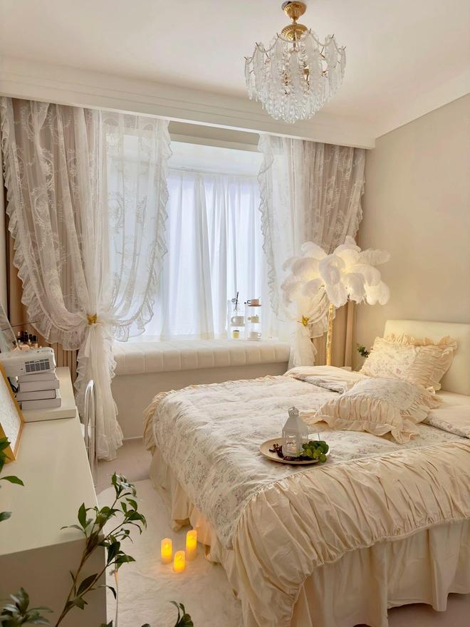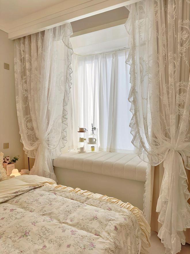 窗帘安装了三层,窗前一层柔纱帘,靠近室内的部分安装了奶茶色布艺帘和蕾丝窗帘,太漂亮了!