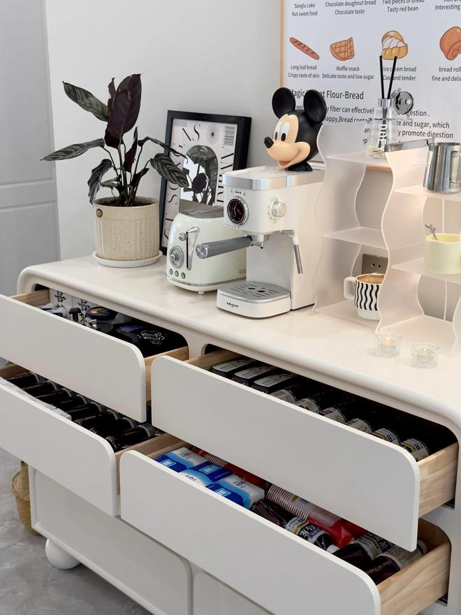 餐边柜由六个小抽屉组成,里面整齐地收纳着零食、饮品和家庭囤货,拿取一目了然。