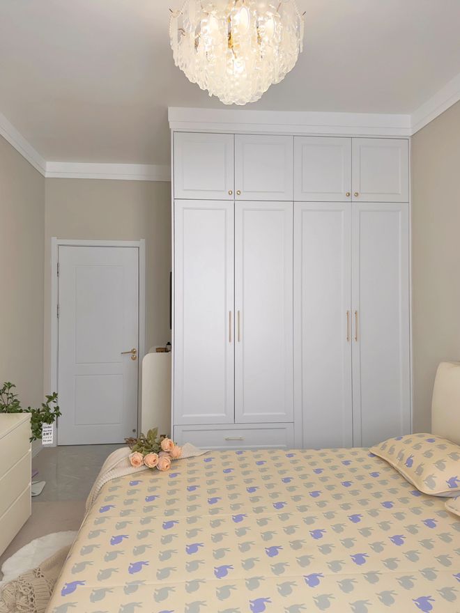 次卧的面积约10㎡,比主卧的面积小很多,屋主靠墙定制了顶天立地的大衣柜,柜子采用了分段式设计,下面是“长柜门+抽屉”,上面则做了吊柜。